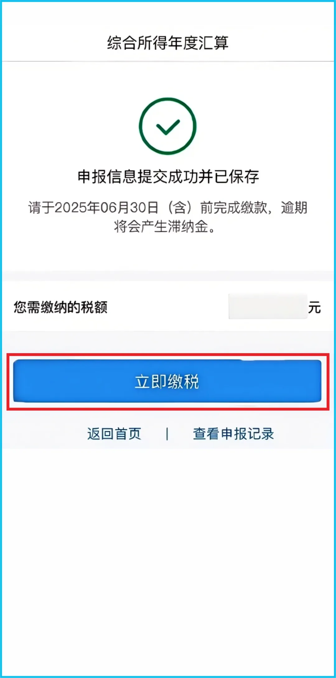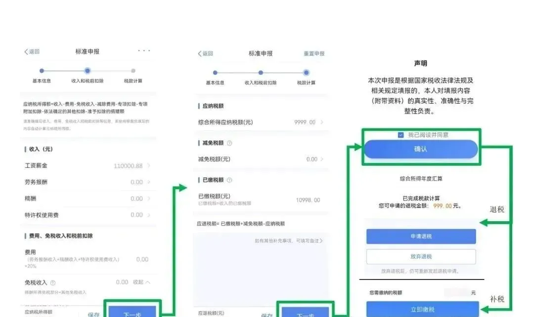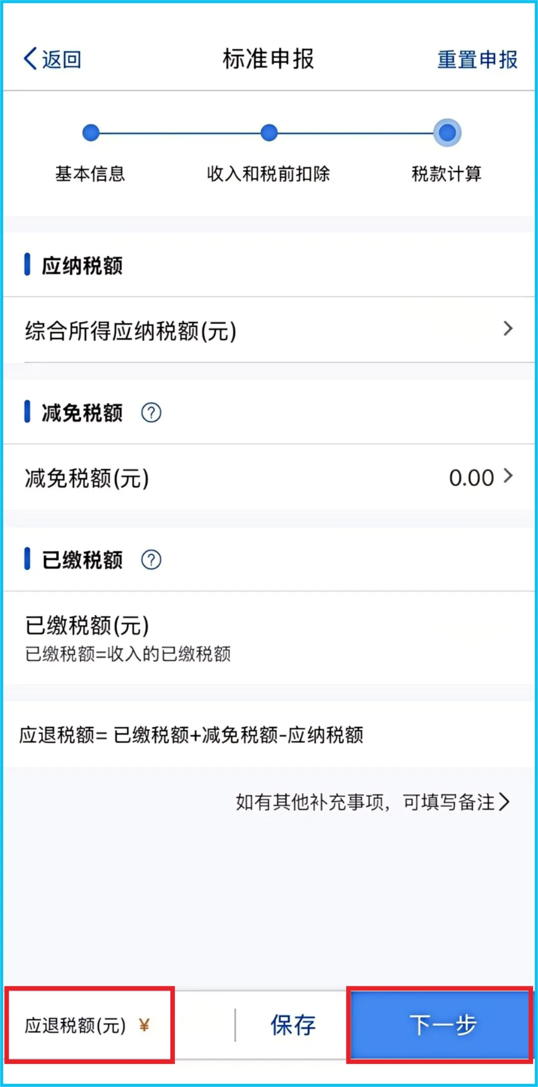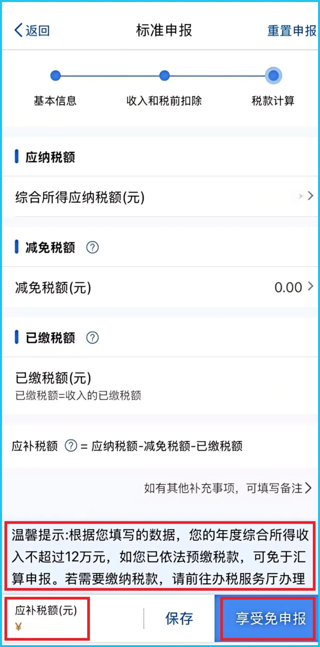 系统会根据您填报的信息,自动计算出您的【应补税额】或【应退税额】。