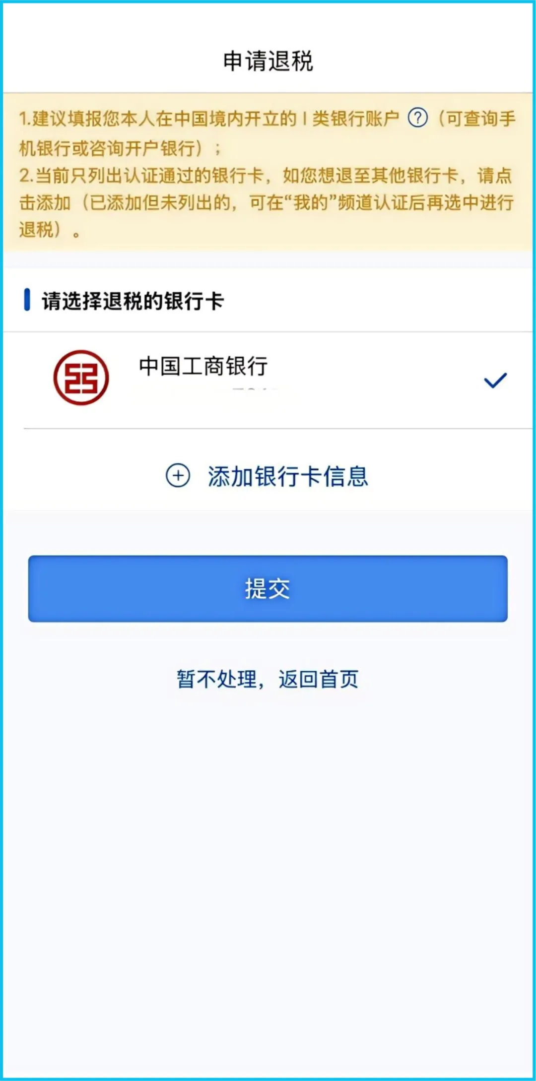 系统显示“应退税额”的,点击【下一步】,点击【申请退税】,阅读“特别提醒”后,点击【继续退税】,选择绑定的银行卡,确保所选的银行卡符合退税要求后点击【提交】,点击【继续退税】,完成退税申请。
