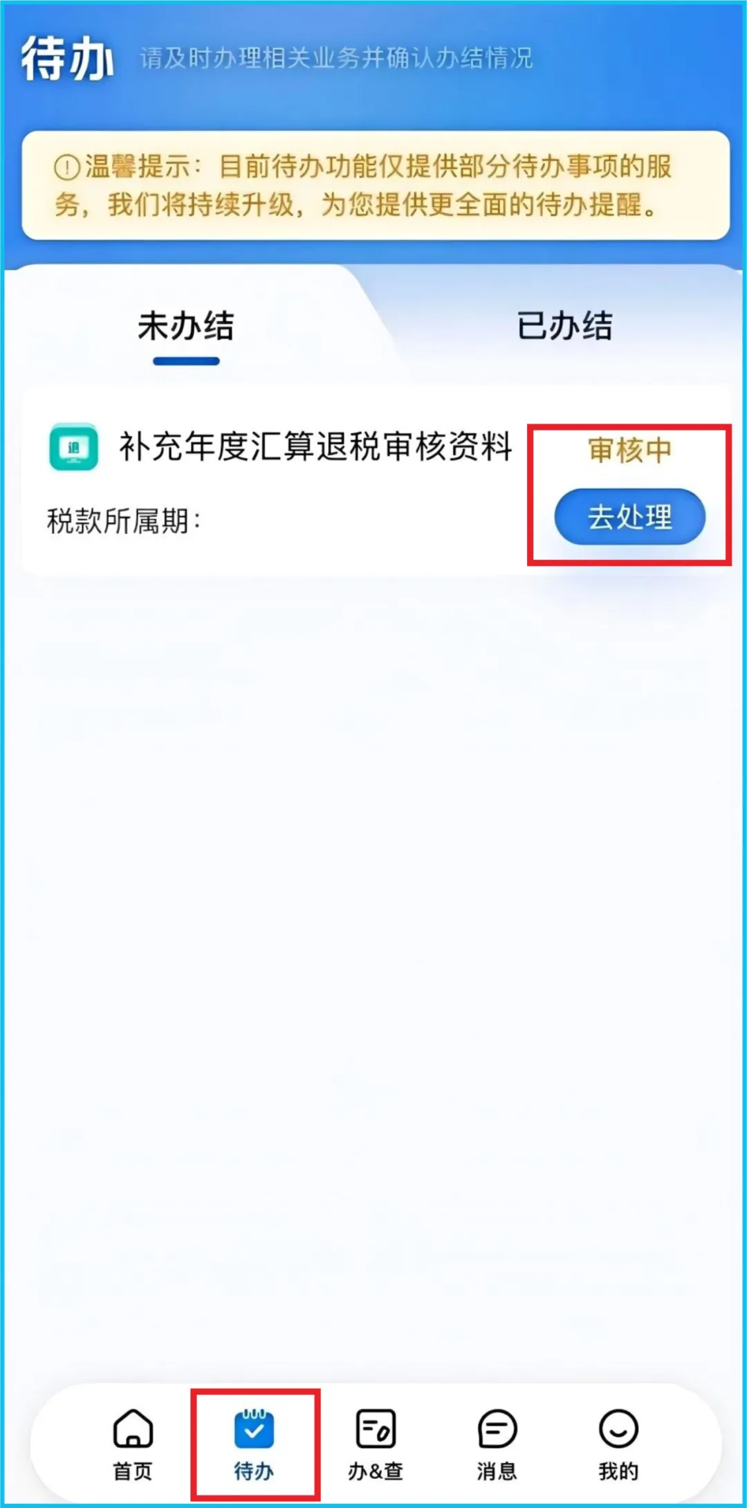 您提交退税申请后,税务机关可通过个税APP及网站消息、手机短信、电话等方式开展提醒,接收该消息后,请您及时补充资料或者更正汇算清缴申报。如需补充资料,可在个税APP【待办】的“补充年度汇算退税审核资料”事项,点击【去处理】,根据税务机关审核意见【上传资料】并填写【情况说明】后点击【提交】。