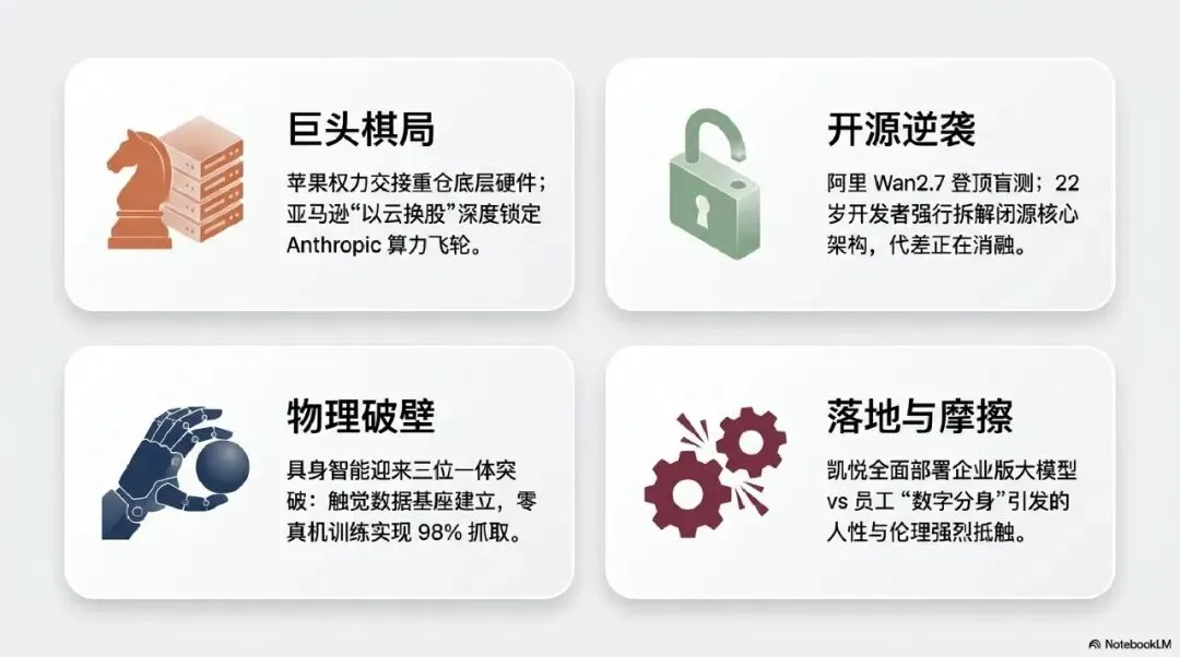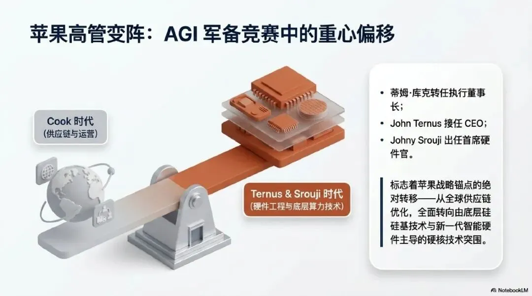 决策者:理解苹果权力交接背后的“第二曲线”焦虑。库克转任执行董事长,John Ternus 走马上任,标志着苹果从“运营驱动”向“硬件+AI 深度协同”的重心偏移 。亚马逊对 Anthropic 的追加投资,实质上是“以云换股”战略的升级版,千亿云服务大单锁定的不仅是算力,更是 AGI 时代的流量入口 。