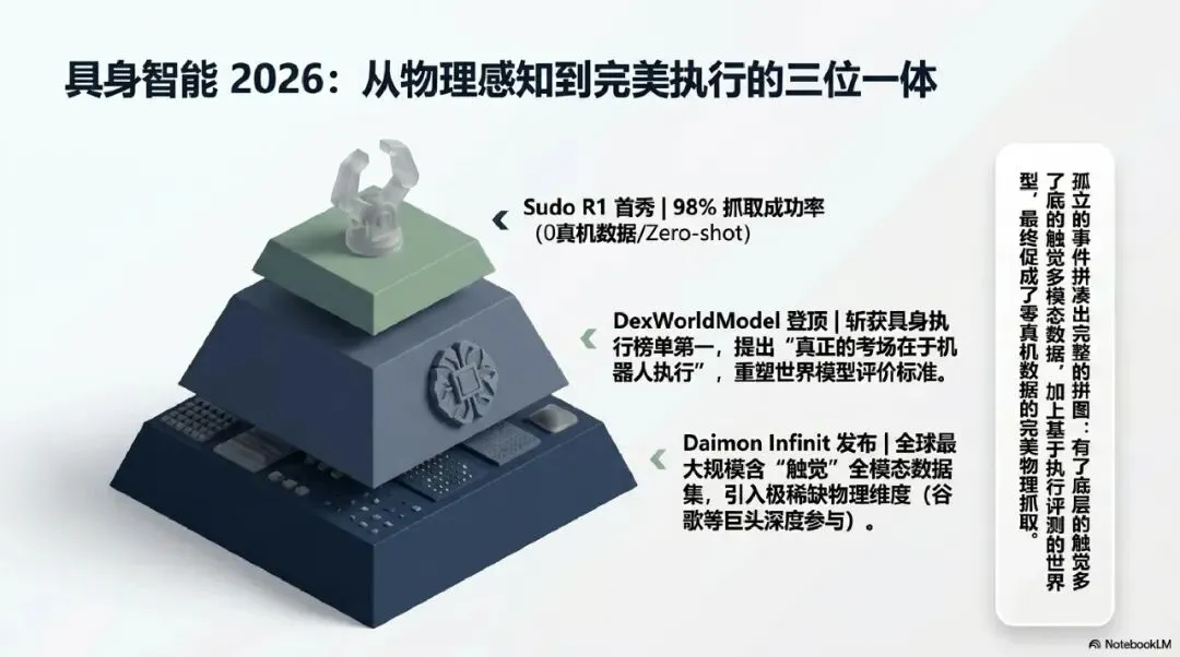 AI+创业者:在“触觉数据”与“行业闭环”中寻找结构性机会。跨维智能 DexWorldModel 登顶具身执行榜单,证明了评价标准正从“看懂”转向“做对” 。Daimon Infinit 触觉数据集的发布,补齐了物理世界模拟的最后一块拼图 。创业者应关注如何利用支付宝集成组件等工具实现商业快速变现,而非在已经透明化的基础架构上死磕 。