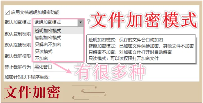 包括透明加密、智能加密、只解密不加密、只读、落地加密、全盘加密等,非常灵活。