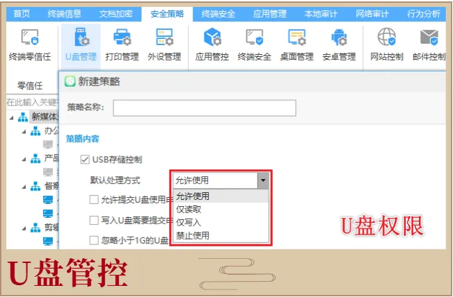 可以设置U盘的使用权限,比如禁止使用、仅读取、仅写入、白名单等。