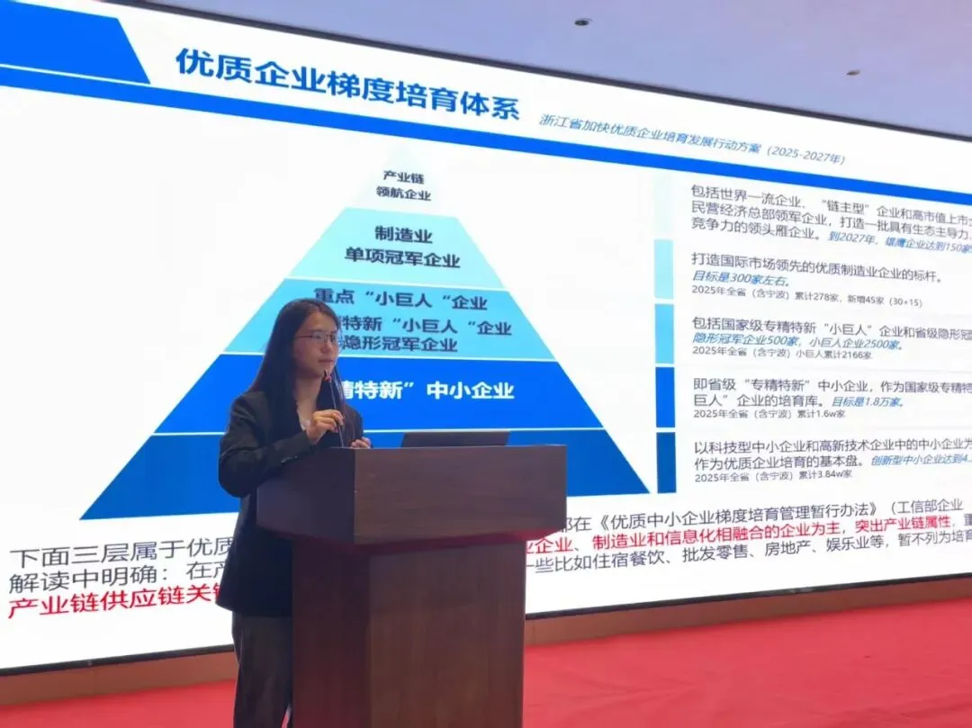 浙江省工信院企业发展研究所王琼萱老师详细解读了专精特新梯度培育的逻辑与申报路径,围绕不同培育阶段的企业专精特新申报要求,对评价标准等内容进行了细致解读,帮助企业明确成长方向。