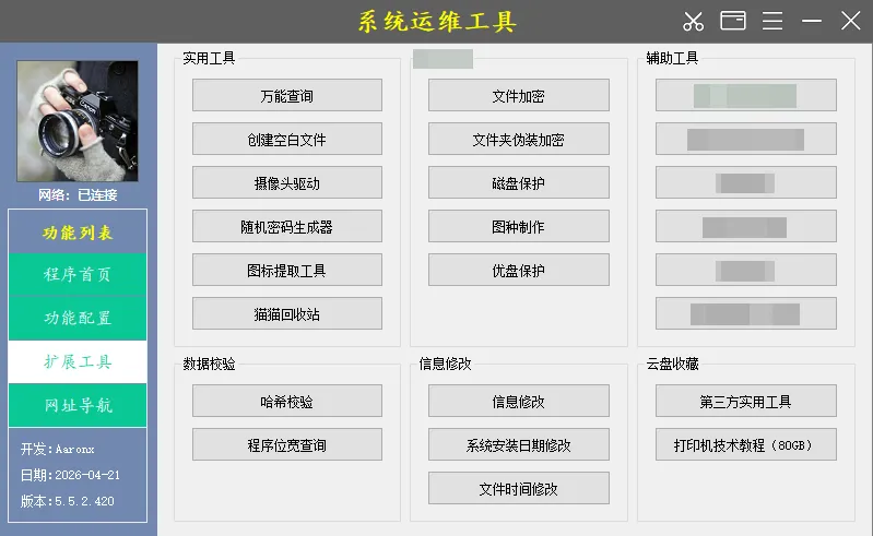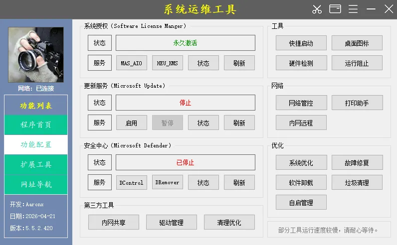 其主要有3大功能:系统配置与授权管理、网络与硬件运维、实用工具与安全防护,尤其是扩展工具中的“辅助工具”,相信很多人都会用到。