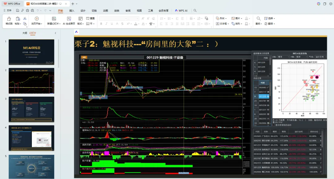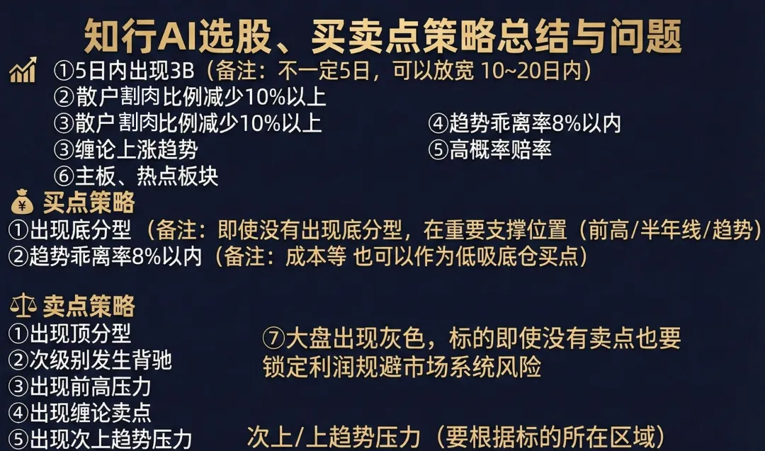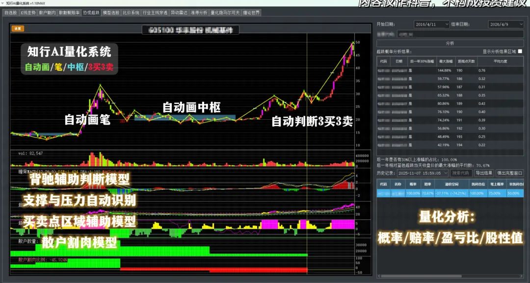 交叉验证:知行AI在原著基础上,叠加散户割肉、超跌、量化概率等模块进行交叉验证,增强对趋势、中枢、买卖点判断的确定性。