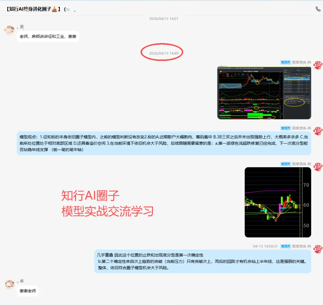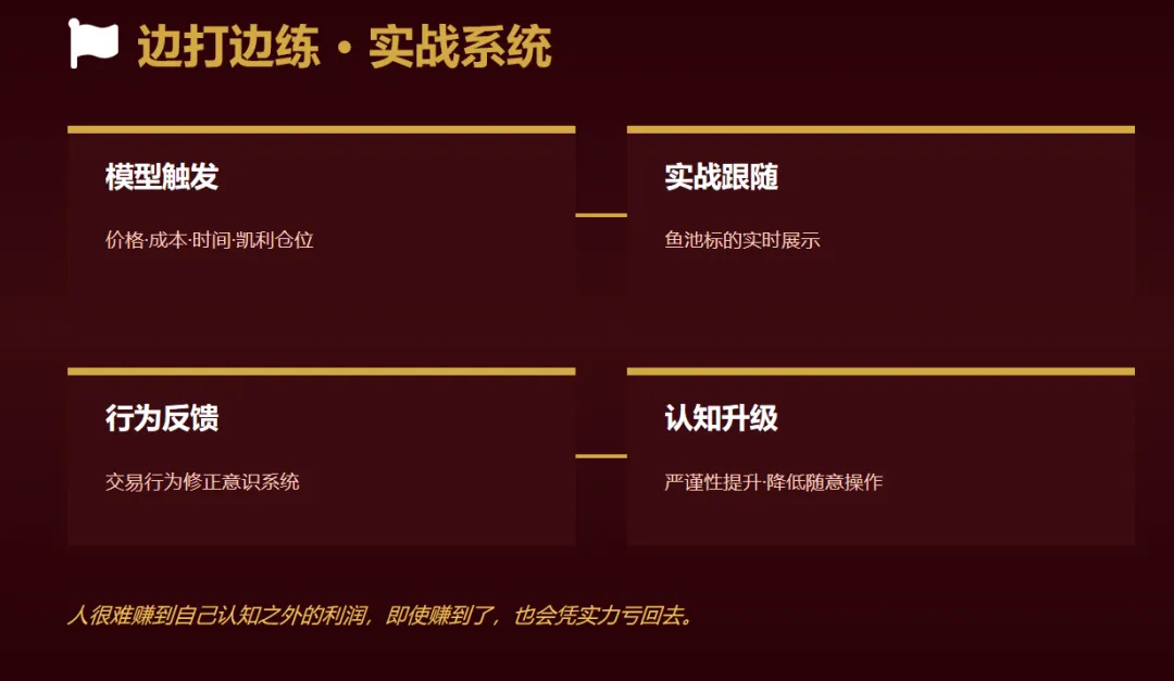 ③ “边打边练,干中学” 是最快的成长方式。每月高架师会议、专属鱼池、交易细节教程,都让大家可以跟随模型对比验证,逐步形成自己的系统。