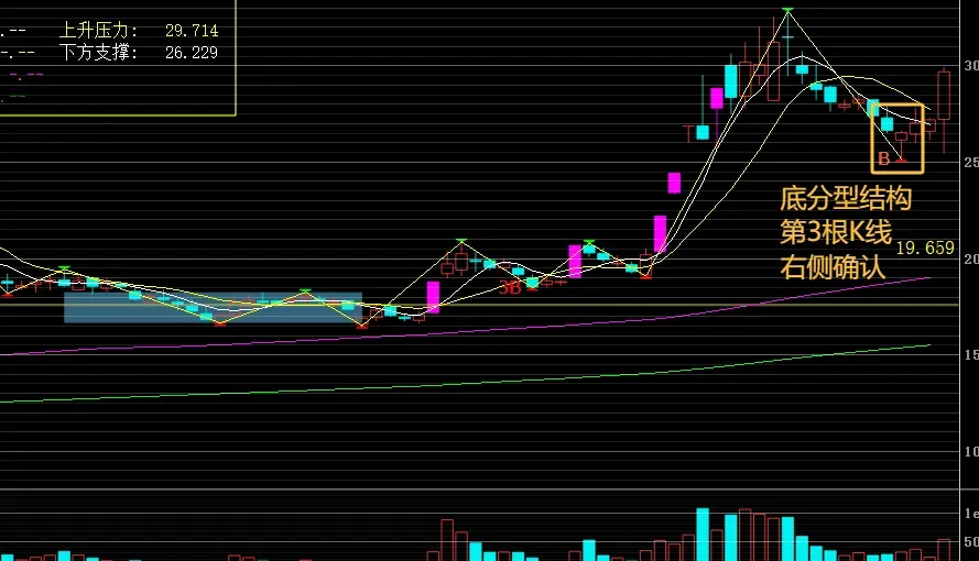 有效确认:当 3B 或 B 出现时,需要等底分型最右侧第三根K线结构稳定后(即底分型完整形成),才算真正有效。