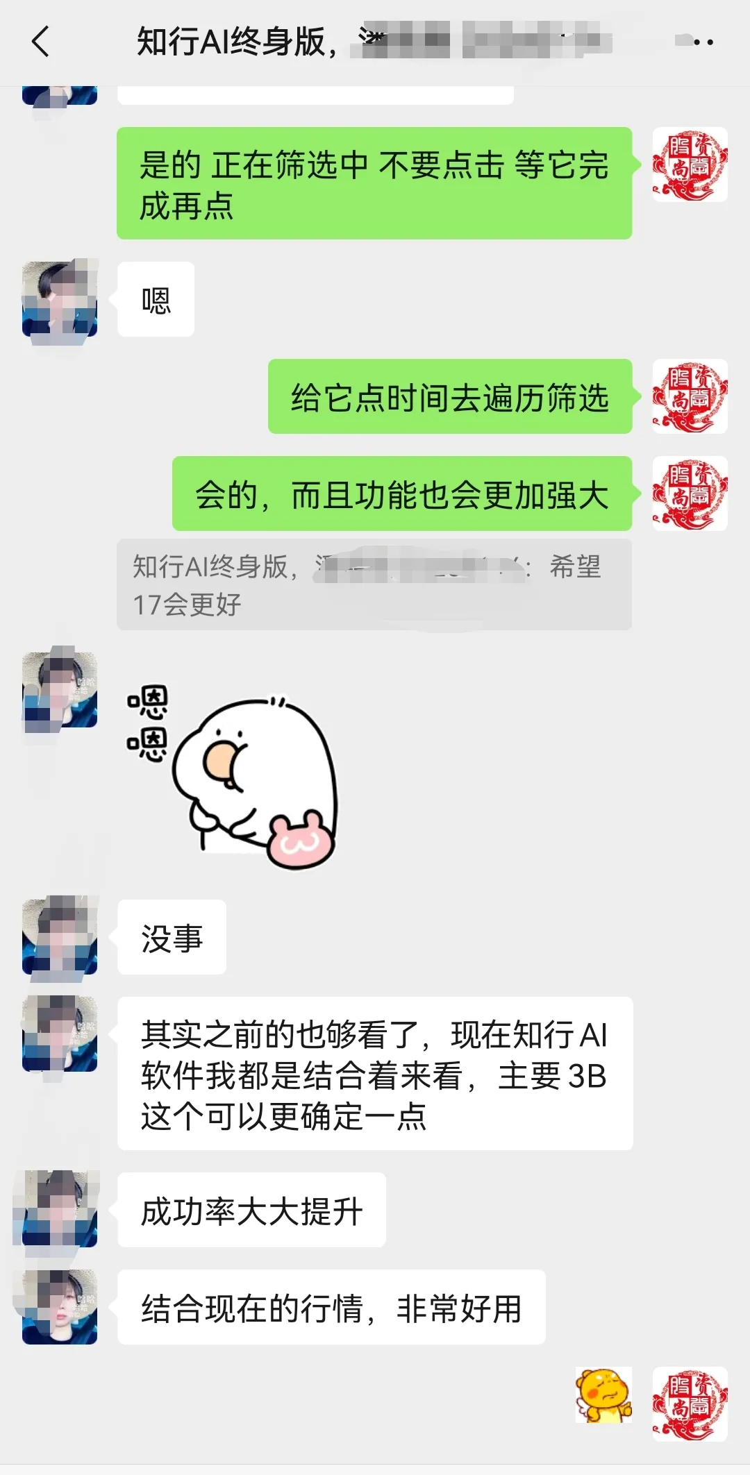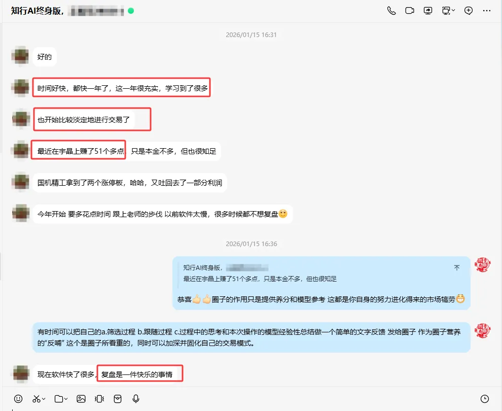 简单说:就是由于圈子模型的特性属于低吸,容错率高,大家是用知行AI来补短板、强长板,而不是照搬同一策略。用户越多,反哺的有效模型也越多,系统会不断进化。