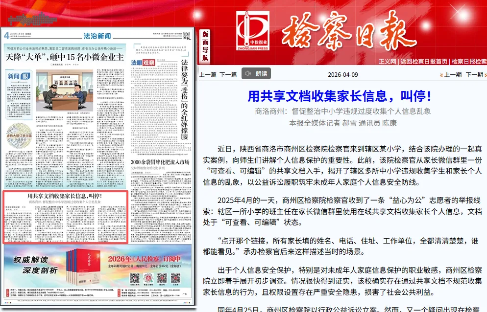 2025年9月15日,商州区检察院依法向负有监管职责的行政机关发出检察建议,明确提出,全面排查辖区中小学收集学生及家长个人信息的情况;立即叫停共享文档等不安全的信息收集行为,并通过规范方式替代;压实学校与主管部门责任,确保个人信息收集合法、必要、安全。