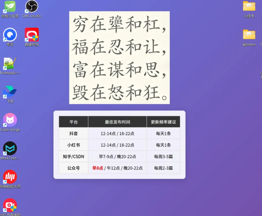 就像我最近做一人公司内容,要兼顾抖音、小红书、公众号、知乎,手里的发布时间表(如下),翻来翻去实在麻烦,索性想了个笨办法——把提醒直接贴在桌面!