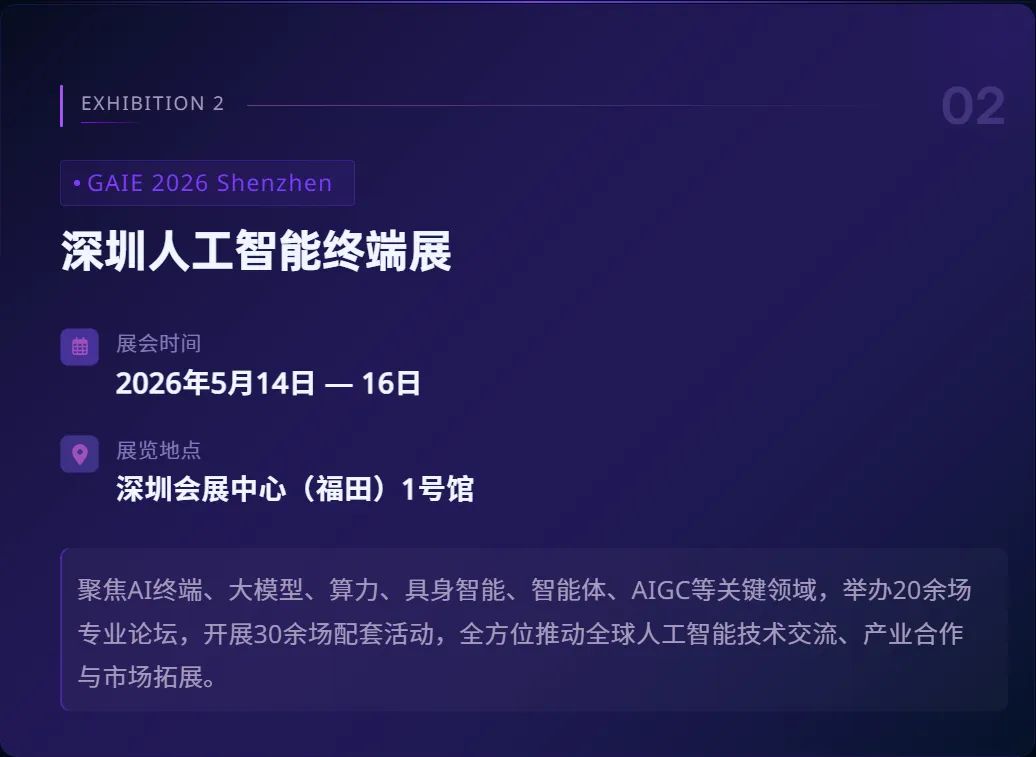5月14日至16日,2026全球人工智能终端展将在深圳会展中心(福田)盛大举办。本届展会以“可信AI – 共创价值新生态”为核心主题,将打造30000㎡沉浸式展示空间,覆盖人工智能终端、具身智能与人形机器人、大模型及行业应用解决方案等核心板块。