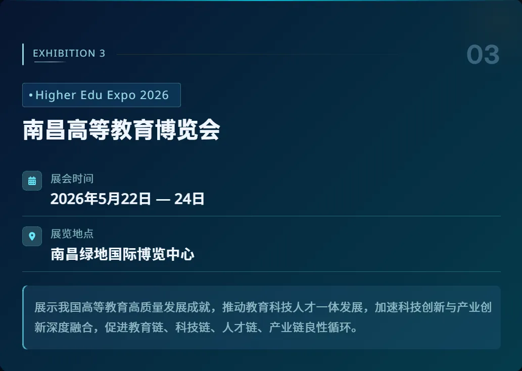 5月22日至24日,第64届高等教育博览会将在江西南昌绿地国际博览中心举行。本届高博会以“赋能·协同·卓越:服务高等教育强国建设”为主题,预计吸引1500余所高校参会。