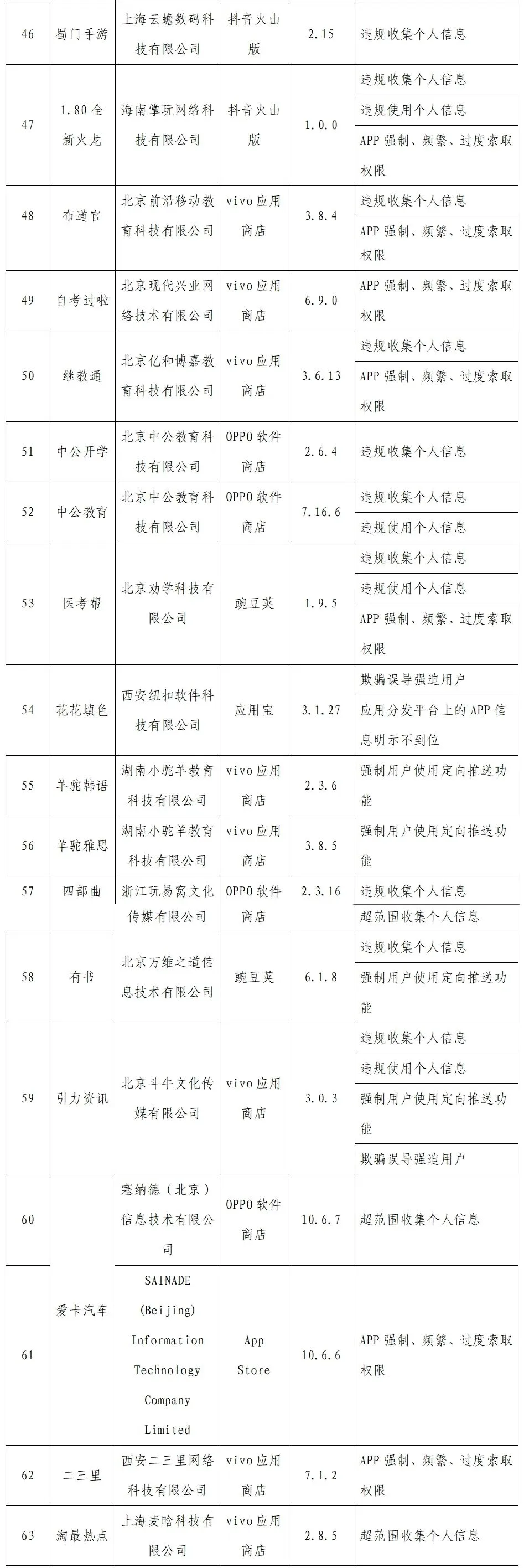 依据《个人信息保护法》《网络安全法》《电信条例》《电信和互联网用户个人信息保护规定》等法律法规,我部近期组织第三方检测机构对移动互联网应用程序(App)进行检查,截至目前,尚有107款App未完成整改。同时,检测过程中发现,13款内嵌第三方软件开发工具包(SDK)存在违规收集用户设备信息的行为(详见附件)。