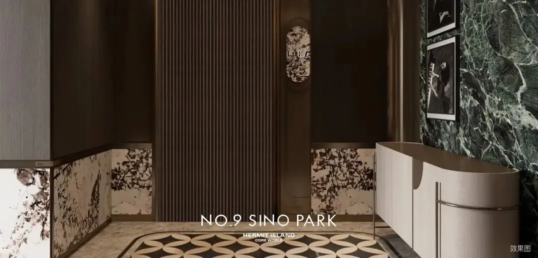 七星级酒店式归家场景,结合镂空艺术砖加金属铝板营造的环岛门厅双入户大堂归家礼序,用艺术包裹每一寸匠心。