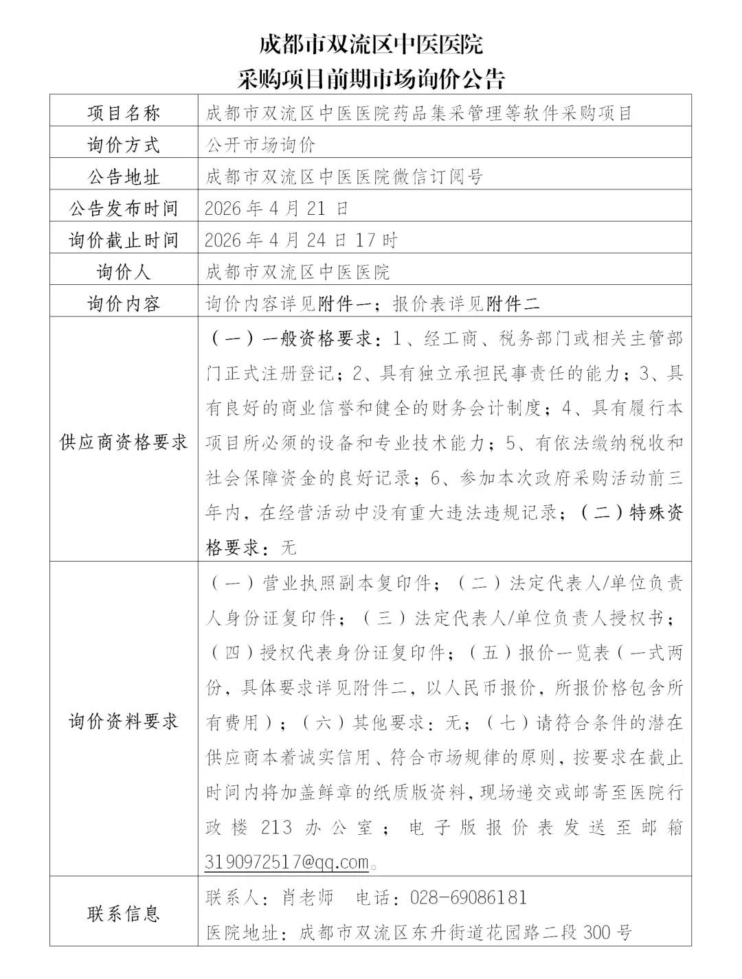 成都市双流区中医医院药品集采管理等软件采购项目前期市场询价公告 附件1:成都市双流区中医医院药品集采管理等软件采购项目前期市场询价内容 附件2:成都市双流区中医医院药品集采管理等软件采购项目报价表 来源|信息中心 编辑|徐思宇 核稿|肖龙、王凤 审发|唐闯