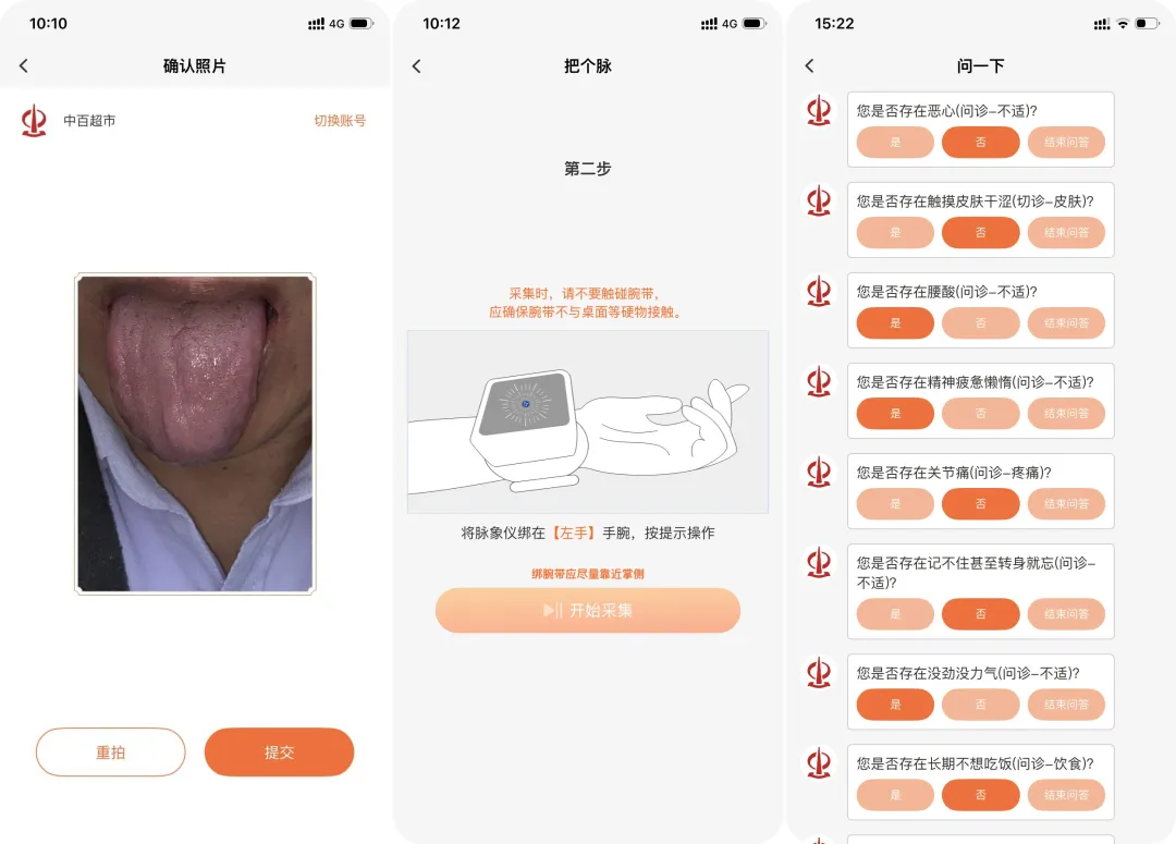 症状初选→拍舌头→AI把脉→回答几个问题→报告到手。