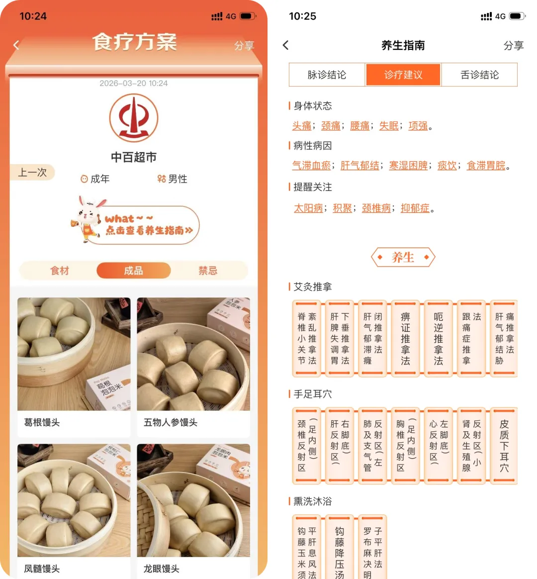 点开“养生指南”,还能看到:主诉症状、脉象舌象描述、体质评估、病因分析,以及艾灸、推拿、拔罐、手足耳穴等调理方案。甚至还有食药物质建议。