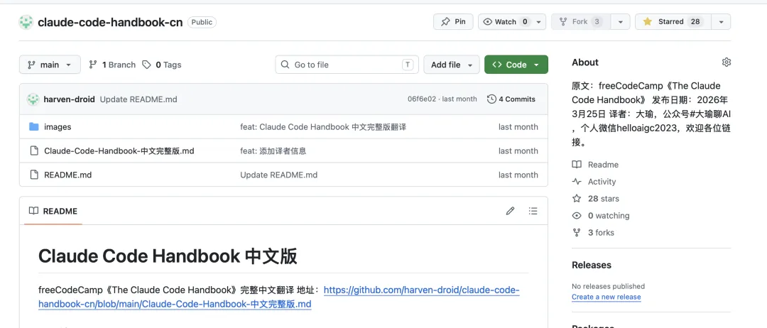 这就是我将claude-code-handbook翻译放到github,现在已经28个star,效果大家可以看看。