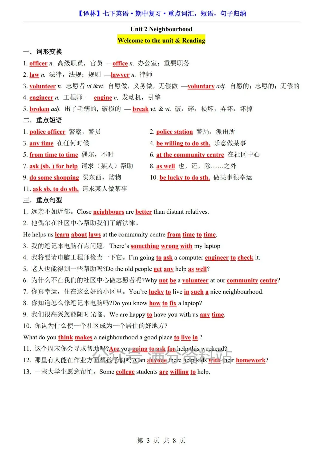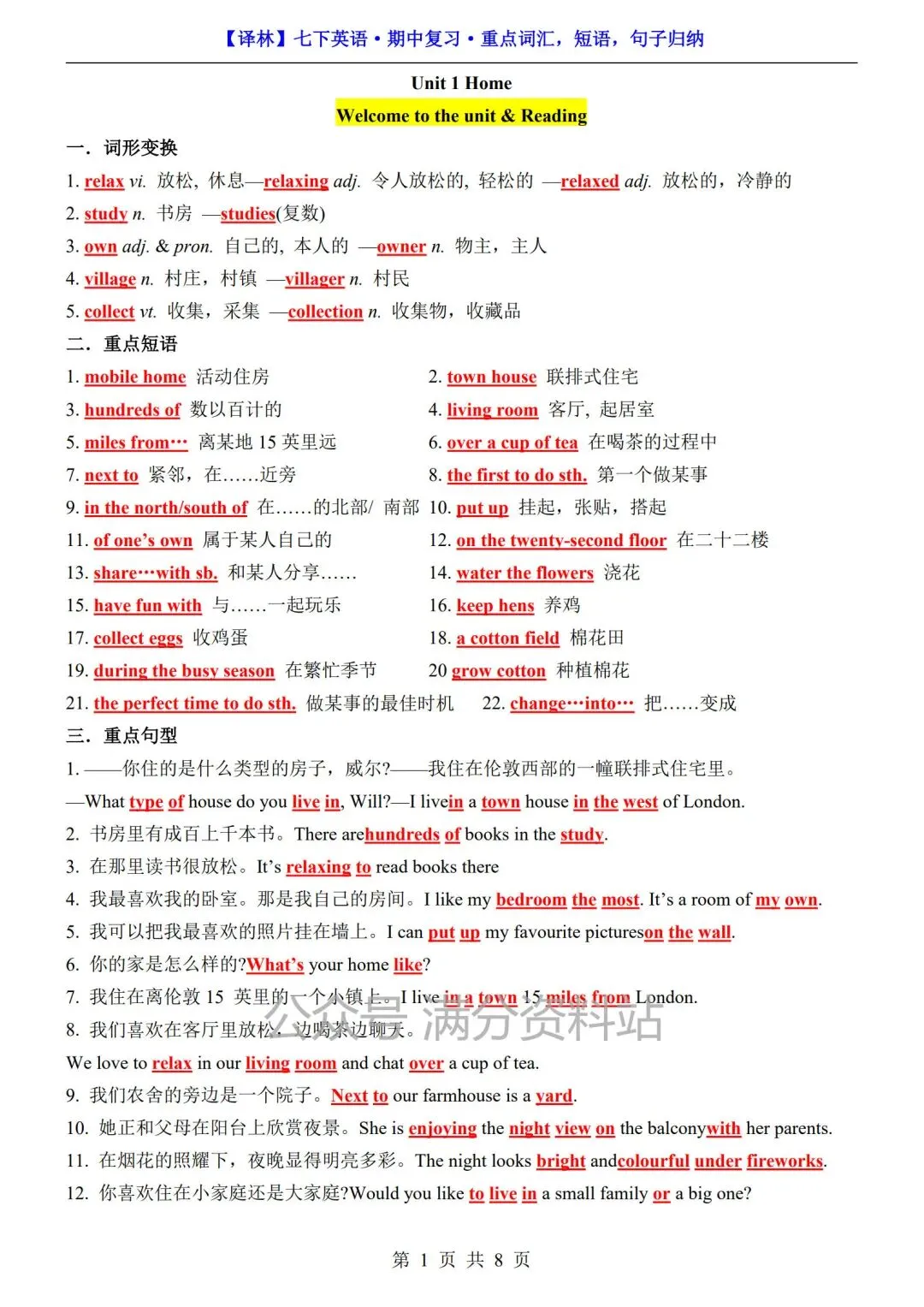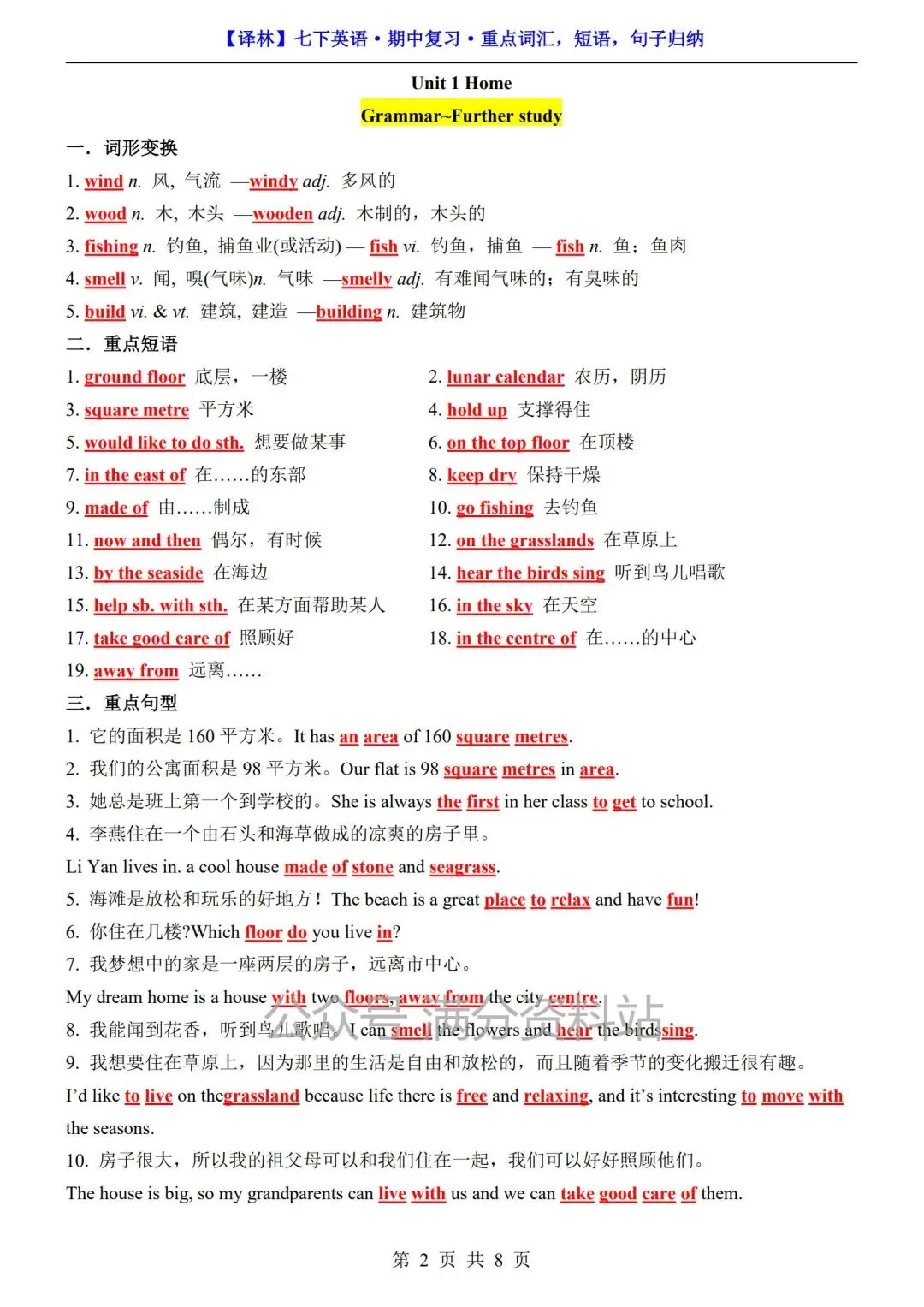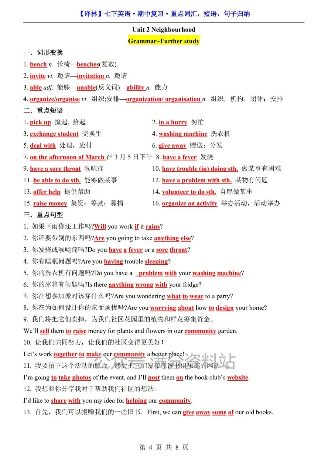 26年春七年级下册译林版英语期中复习重点词汇,短语,句子归纳总结,可打印!