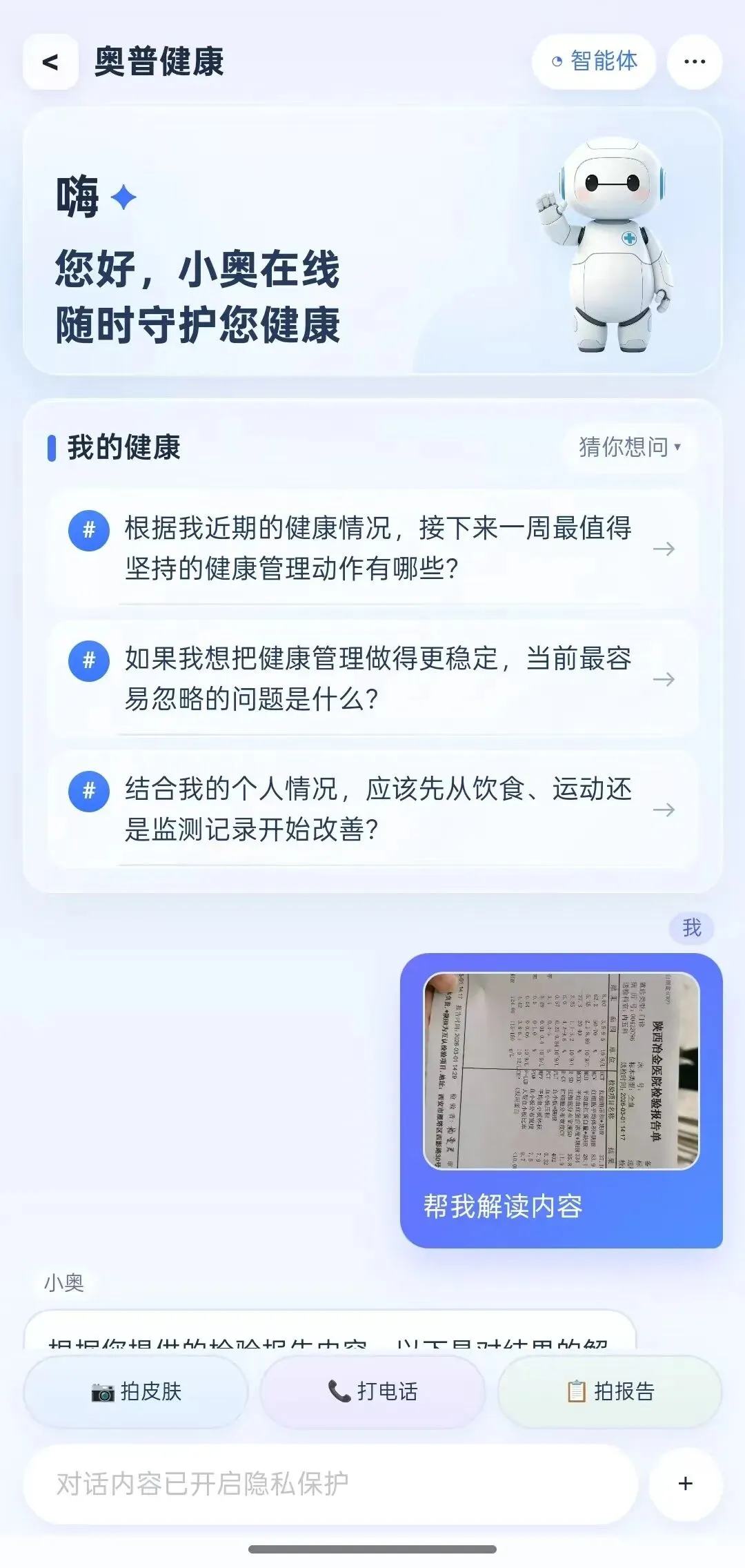 本次更新对奥普智问AI进行深度重构优化,依托大模型技术加持,响应更迅捷、理解更精准、交互更自然。无论是健康咨询、数据解读、使用指导,AI都能快速给出专业可靠的解答,让智能服务触手可及,成为你身边24小时在线的健康助手。