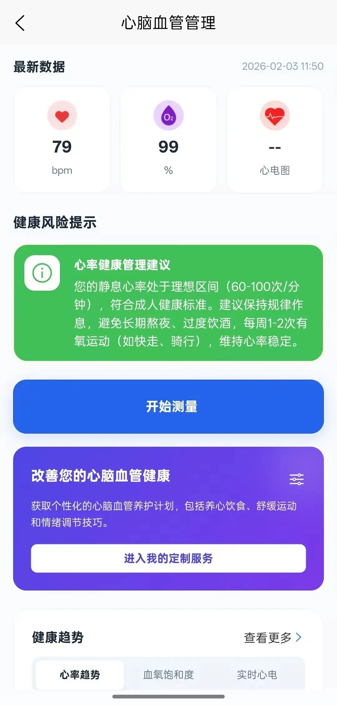 本次版本重磅上线八大健康管理核心模块,覆盖体重管理、呼吸睡眠、心理健康、心脑血管、血脂、血糖、尿酸、血压健康,从躯体健康到心理状态,从慢病监测到日常调理,实现全场景、全周期健康覆盖。
