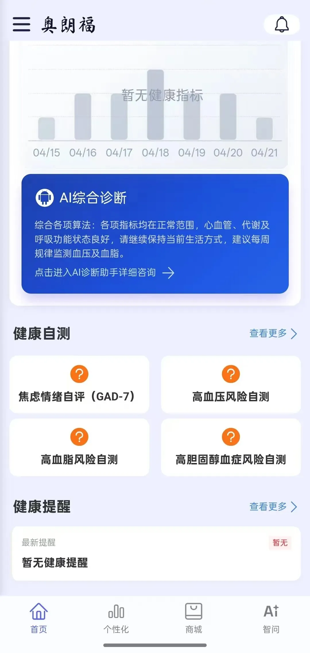 奥普APP生产环境新版本正式发布,以AI技术重构与全维度健康管理为核心,从智能交互到健康监测、从风险预警到个性化方案,用更前沿的科技、更温暖的服务,打造一站式智能健康管家,为每一位用户的身心健康保驾护航。