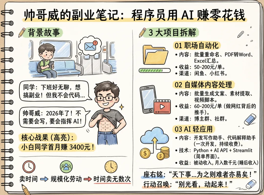 所以今天的这篇文章,我直接给你拆解:程序员做 AI 副业,最容易赚钱的 3 个轻量项目。不用懂高深算法,不用读论文,不用成为技术大牛。你只需要一个能跑 Python 的电脑,一个会用 AI 的脑子。