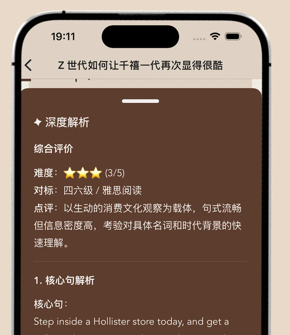 在每一篇精读文章中都接入了 AI 深度解析。它不只是翻译,它会像一个老练的编辑,告诉你这个句子背后的背景是什么,这个词为什么在这里用得高级,这个长难句的逻辑骨架到底是怎么搭起来的。