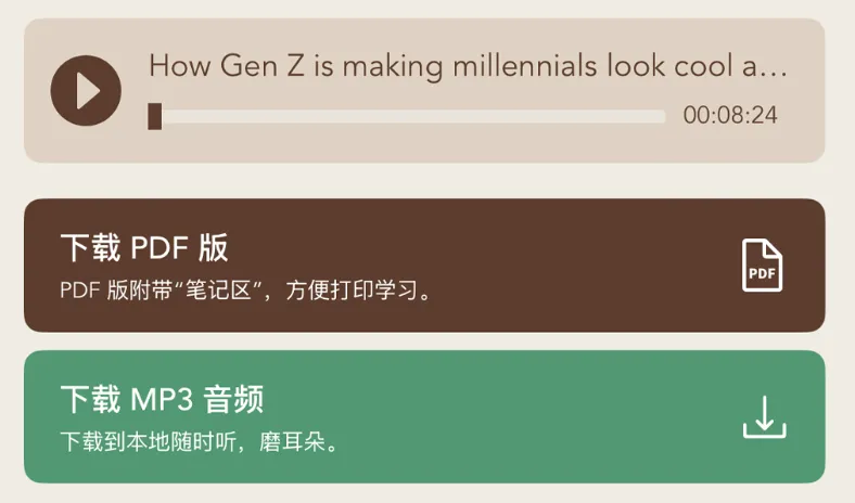 MP3 离线: 把地道的外刊原声下载到手机里,在通勤、跑步、甚至做家务的时候,让这些地道的表达反复冲刷你的耳膜。