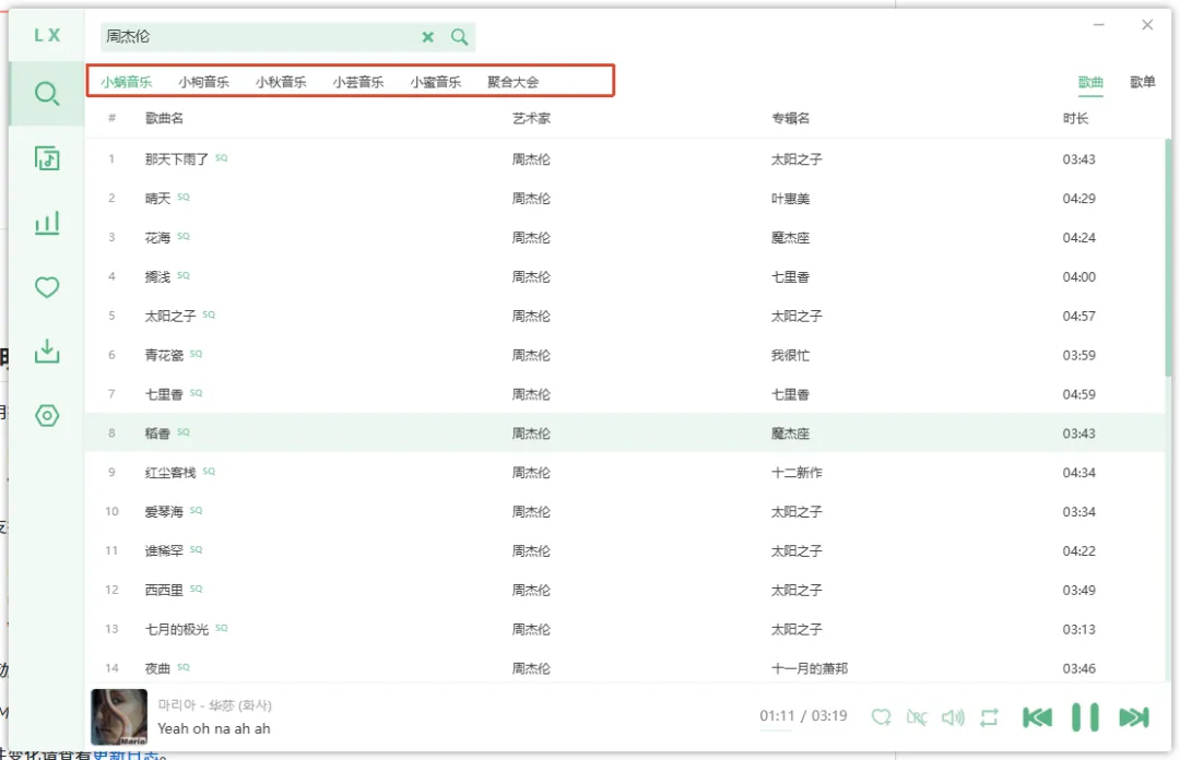 洛雪音乐支持网易云音乐、QQ音乐、酷狗音乐、酷我音乐、咪咕音乐、Bilibili等多个平台音乐资源的搜索。