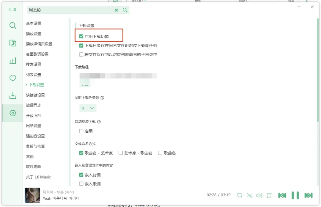 洛雪音乐也支持音乐下载,不过这个功能需要你在设置里面提前开启才可以。你在其他平台想下个音乐,得开会员;洛雪音乐里,音乐直接下,不用花一分钱。