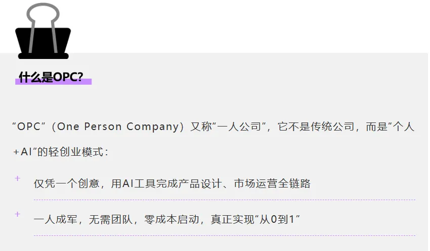笔者回顾自己在职场打拼的这20年,竟然悉数经历了上面的四个时代,有过高光时刻,也有过行差踏错;拿到过大的结果,也曾经输得一败涂地。正如查尔斯·狄更斯的长篇小说《双城记》开篇所言:“这是最好的时代,这是最坏的时代;这是智慧的年代,这是愚蠢的年代;这是信仰的时期,这是怀疑的时期;这是光明的季节,这是黑暗的季节;这是希望之春,这是绝望之冬;我们拥有一切,我们一无所有;我们正走向天堂,我们也正直下地狱——简而言之,那时跟现在非常相象,某些最喧嚣的权威坚持要用形容词的最高级来形容它。说它好,是最高级的;说它不好,也是最高级的。”与小说不同的是,身处AI时代的我们,不仅要时时关注大时代下的宏大叙事,也更加关注起个体的长足发展。于是在2026年(农历丙午马年),我们又“马不停蹄”地踏入了一个OPC崛起的时代,这个时代也是“AI超级个体一人公司”的黄金时代!