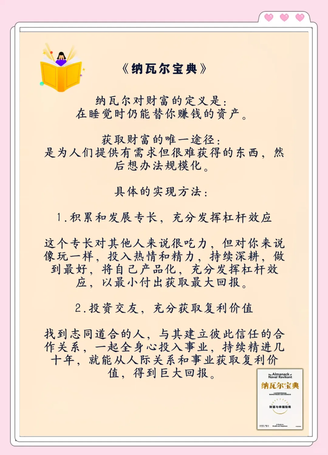 以OPC的形式为载体,实现普通人的逆袭,现在还需要一本实战指南,于是笔者找到了《纳瓦尔宝典》这本书了,书中记录了美国硅谷知名天使投资人纳瓦尔从白手起家到财富自由的智慧箴言。