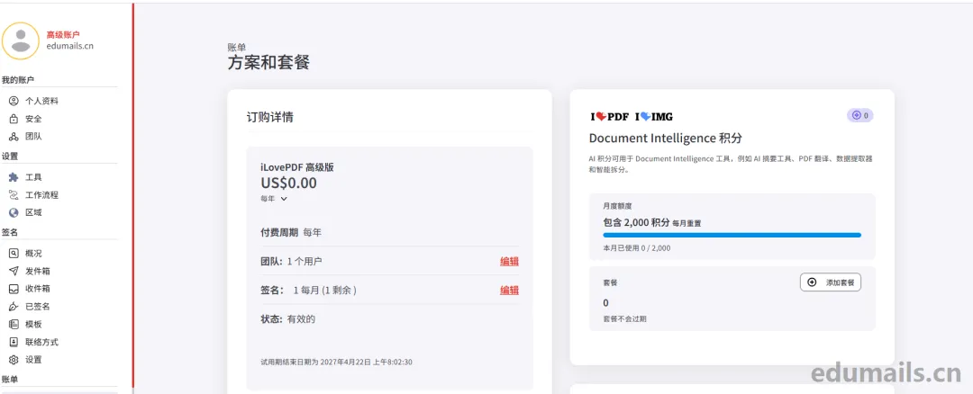 我们进入ilovepdf的用户中心如下图所示,点击网页左下角计划查看到,https://www.ilovepdf.com/user我们的IlovePDF已经升级为高级版。