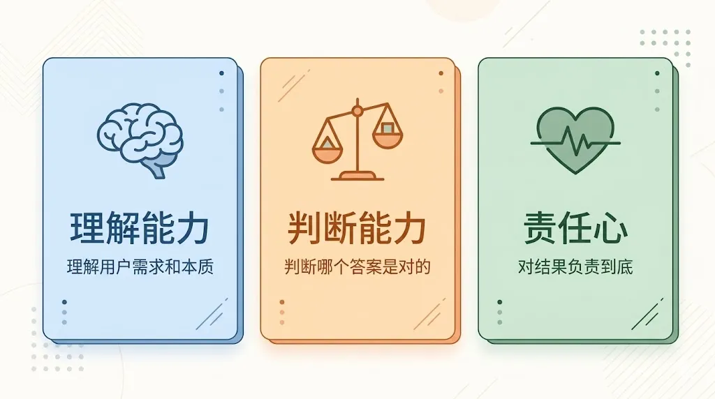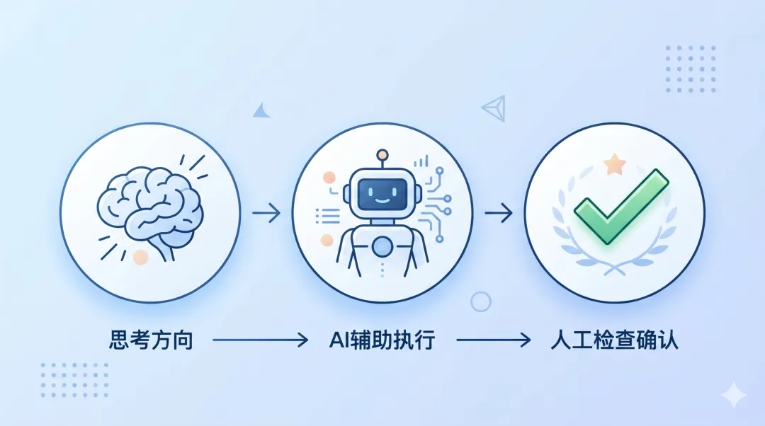 AI是助手,不是保姆。它可以帮你写代码、写文案、做图,但它不会帮你判断”这个需求到底要什么”、”这个逻辑对不对”、”这个结果符不符合标准”。