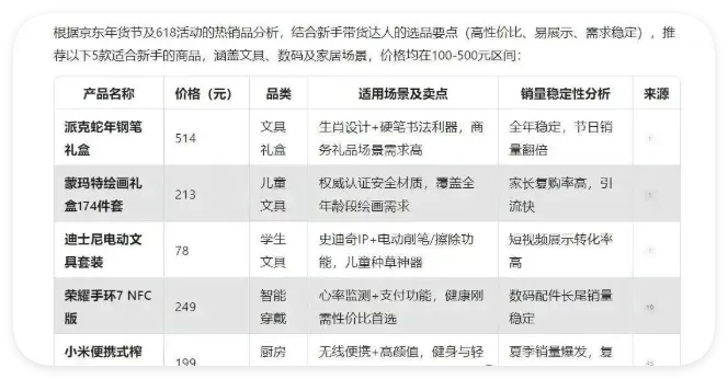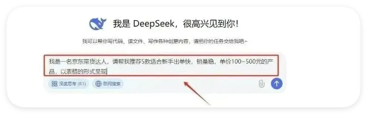打开deepseek,告诉他: 你是一名京东带货达人,请帮我推荐5款适合新手,出单快,销量稳,单价100~500元的产品,以表格的形式展现,
