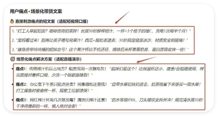 然后我们从中选择一个商品,输入下面这段指令, 接着让deepseek分析出 商品卖点和用户痛点,并生成带货文案,