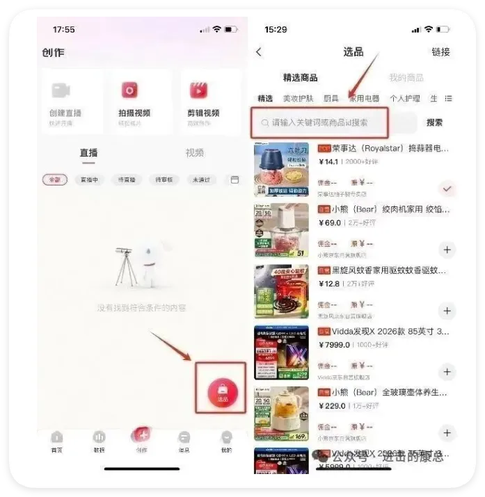 回到某东内容助手,点击右下角加号去选品,搜索你要带的商品加到自己的橱窗,