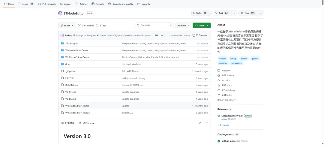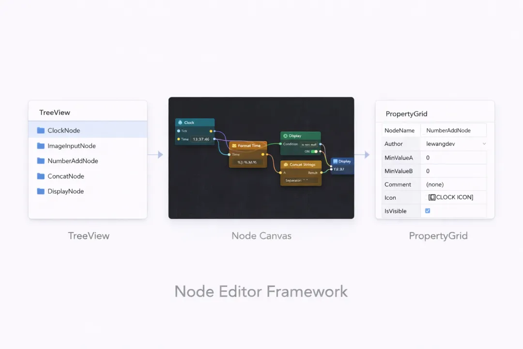 想研究节点编辑器实现的人。 纯 GDI+、无依赖、代码全开源(MIT 协议),是很好的学习样本。TreeView + PropertyGrid + NodeEditor 的组合设计,代码逻辑清晰,不算特别复杂但五脏俱全。