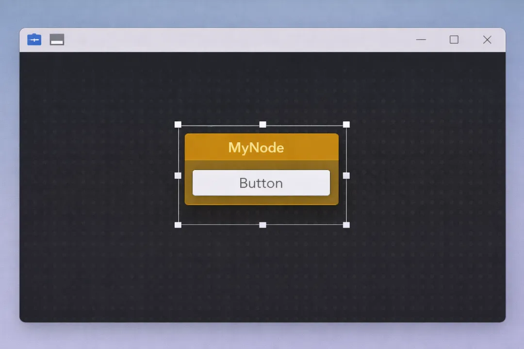 publicclassMyNode : STNode {protectedoverridevoidOnCreate() {base.OnCreate();this.Title = "MyNode";this.TitleColor = Color.FromArgb(200, Color.Goldenrod);this.AutoSize = false;this.Size = new Size(100, 100);var ctrl = new STNodeControl(); ctrl.Text = "Button"; ctrl.Location = new Point(10, 10);this.Controls.Add(ctrl); }}