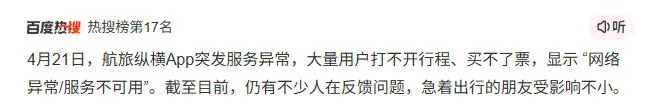 4月21日中午,航旅纵横App突发服务异常,大量用户打不开行程、买不了票,显示 “服务暂时不可用,请稍后再试”。相关话题登上了百度热搜榜。