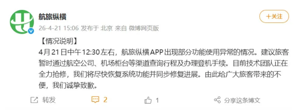 航旅纵横4月21日下午发布微博表示:“4月21日中午12:30左右,航旅纵横App出现部分功能使用异常的情况。建议旅客暂时通过航空公司、机场柜台等渠道查询行程及办理登机手续。目前技术团队正在全力抢修,我们将尽快恢复系统功能并同步修复进展。由此给广大旅客带来的不便,我们诚挚致歉。”