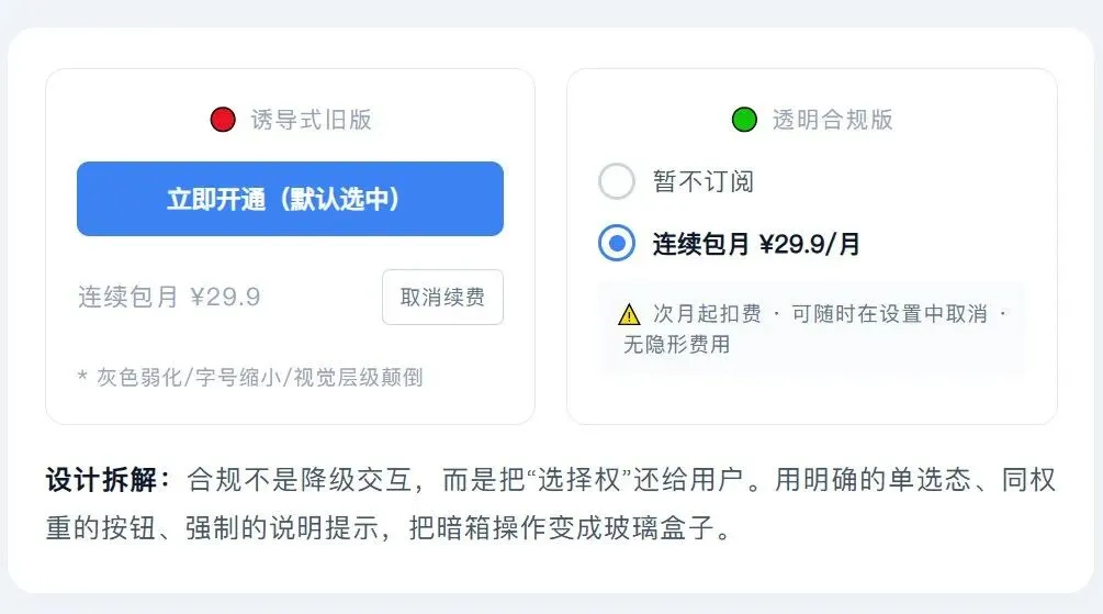 新规一落地,这些“暗黑模式”直接变成合规重灾区。咱们做设计的得明白:利用视觉权重引导用户是对的,但利用视觉欺骗用户,就是越界。