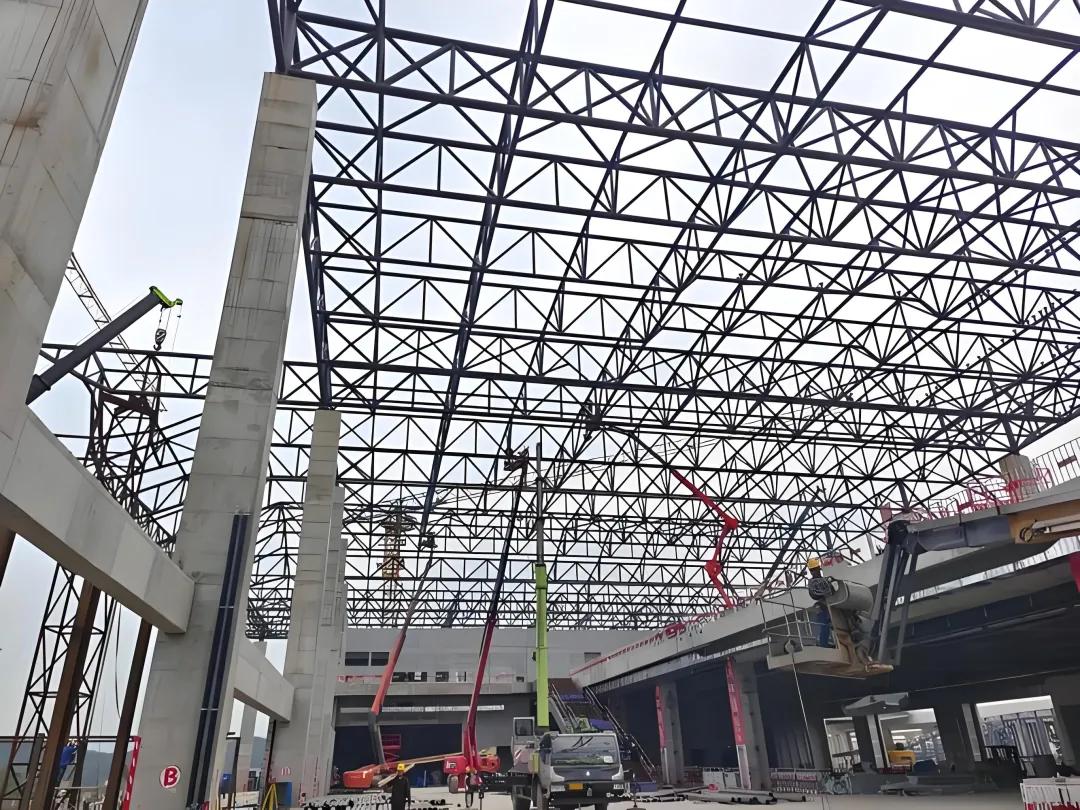 3.分块拼装单元地面预拼,核对跨度、起拱值,预留焊接收缩量,整体吊装至设计位置,与周边杆件对接校正,空中无倾斜、无错位就位。