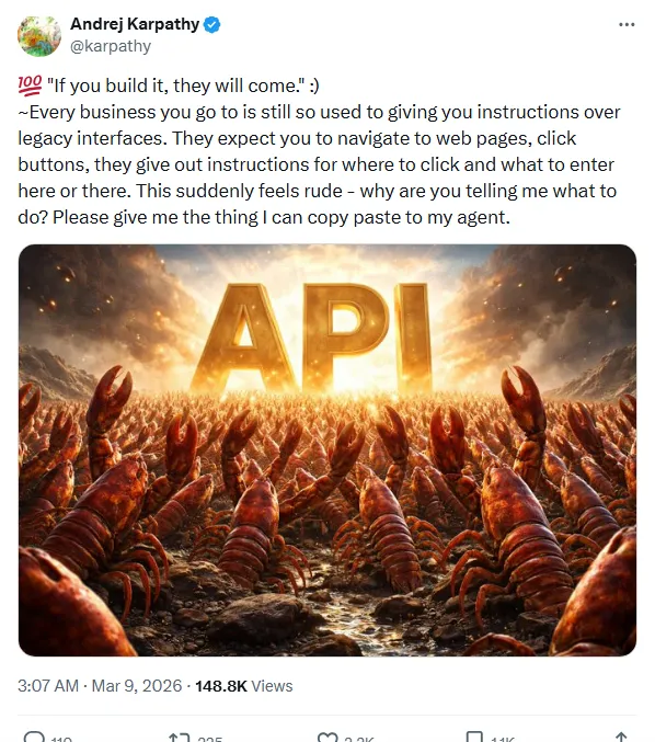 最后想说一句: Karpathy 说”如果你造了,它们就会来”。但反过来也成立——如果你不为 Agent 而造,它们就会去别人那里。