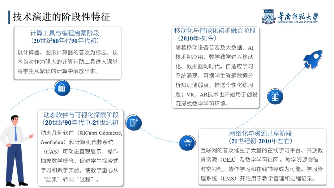 以计算器、图形计算器的普及为标志,技术首次作为强大的计算辅助工具进入课堂,将学生从繁琐的计算中解放出来。