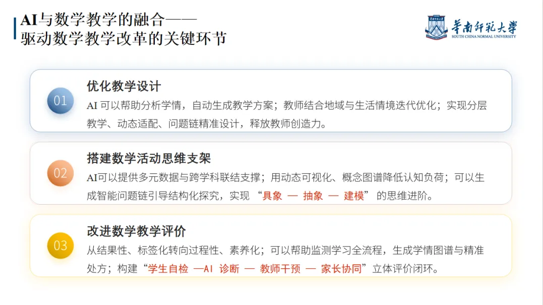 教研是专业成长的阶梯。它促使教师跳出经验主义,以科学方法分析教学问题,从“教书匠”转型为“反思型实践者”。通过课题研究、课例分析展望未来,数学教学的智能化演进将呈现出几个关键趋势。首先是深度个性化学习,AI将不仅关注学生的知识点掌握情况,还会深入到学习风格、认知偏好、情绪状态等更深层次的维度,提供全方位的个性化支持。其次是混合式学习环境的常态化,线上智能平台与线下实体课堂将无缝融合,各取所长。再者,计算思维将被更系统地融入数学教育,学生将学习如何利用算法思想、抽象和建模来解决数学问题,这与AI时代对人才能力的要求高度契合。最后,在AI的辅助下,跨学科整合将变得更加便捷和深入,数学将更容易地与科学、工程、艺术等领域结合,开展基于真实问题的项目式学习。,教师不仅能优化教学设计,更能在理论与实践中构建个人教学智慧。