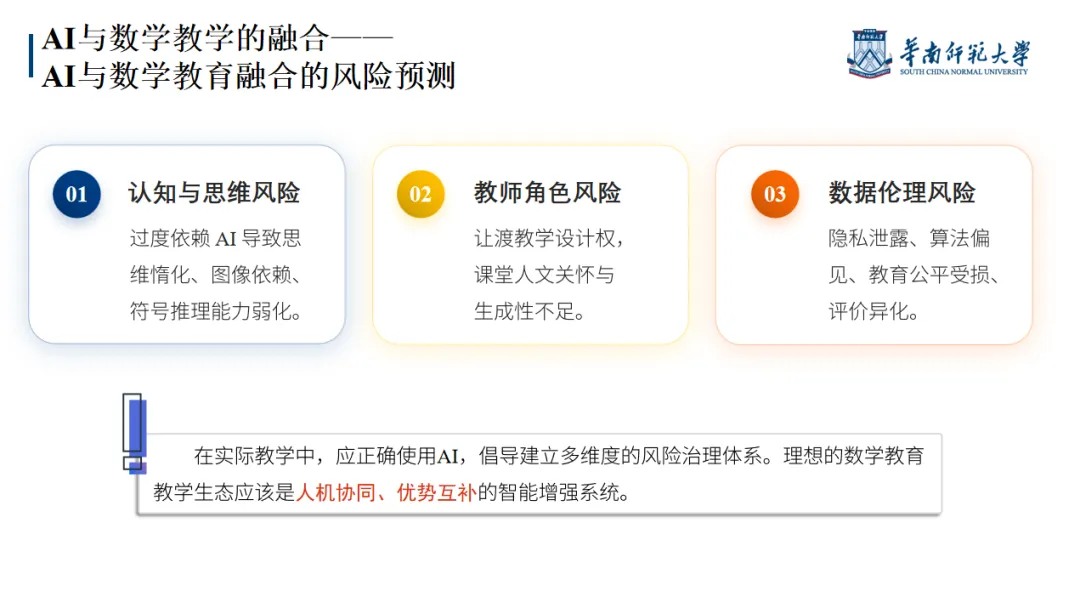 AI 的出现推动数学教学发生系统性、范式级变革,需通过教学设计、数学活动、教学评价三大环节重构落地,同时要应对思维惰化、教师角色、数据伦理三大风险,走 “技术 — 教育 — 伦理” 协同治理之路。