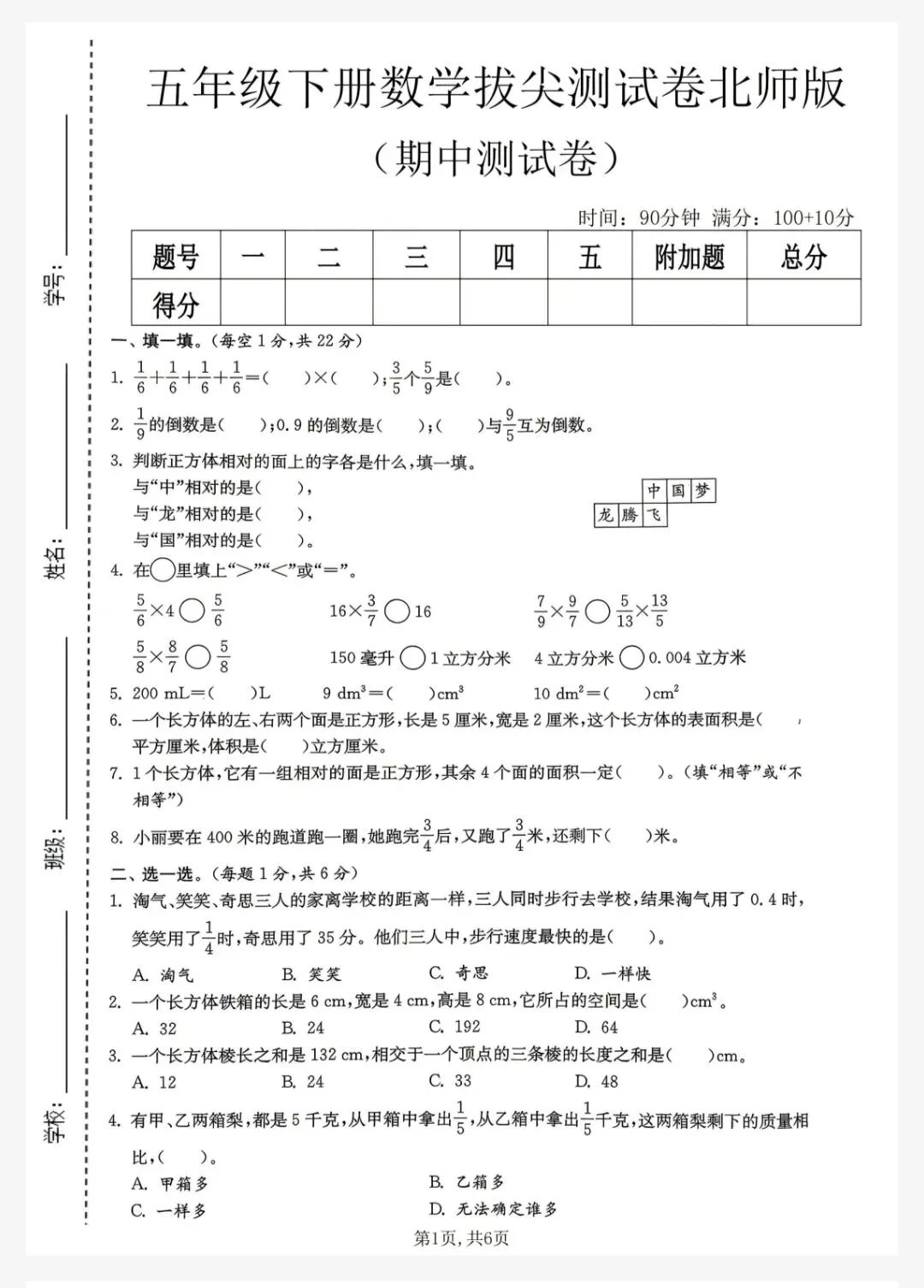 26春北师版数学五年级下册《期中测试卷》含答案 共3套 电子版可打印